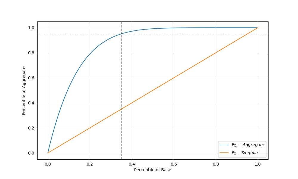 We can also take the inverse of to make more intuitive statements, e.g.Β βpXX of the aggregate is pYY of the baseβ, but we donβt need to belabor this point.